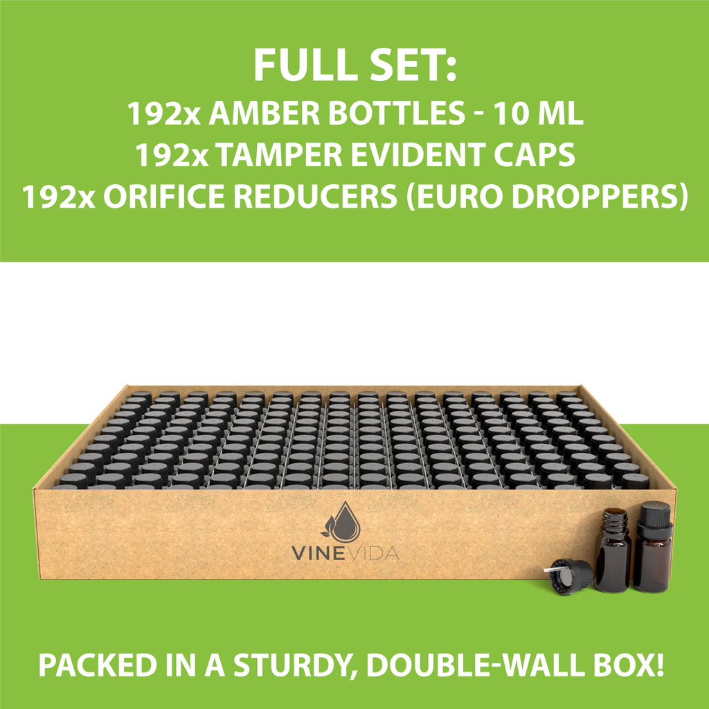 This Essential Oil bottle set contains 12 pcs of 10 mL Amber Glass Boston round bottles, that come with tapered-tip glass droppers.